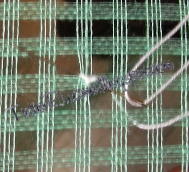 Utilizzando il filo n° 8 partire fissando la gugliata (abbastanza lunga) alla rete : fare un nodo ad una estremità, passare l'ago sotto al punto in cui va fissata la gugliata, puntandolo nella direzione del ricamo, e dentro al filo da ricamo appena sotto il nodo.